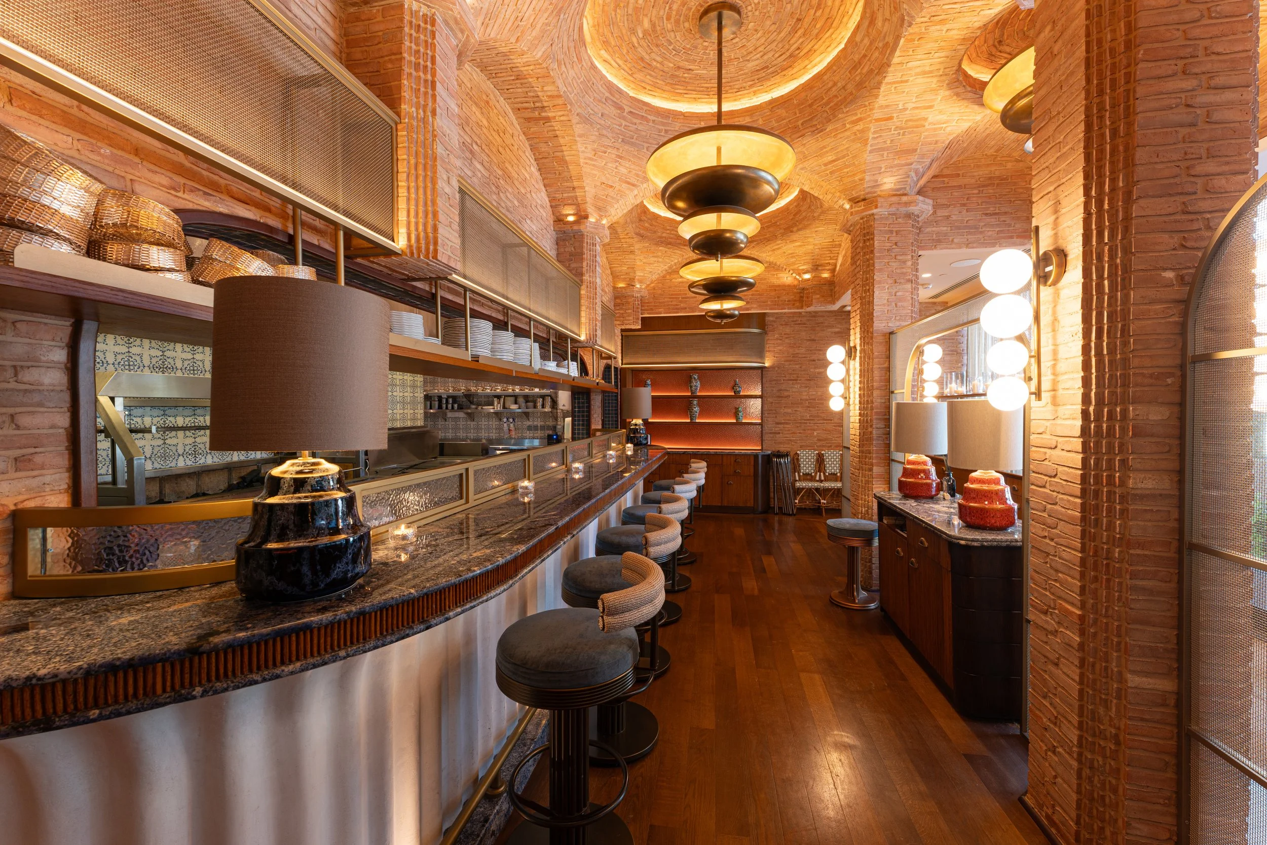 The aesthetic is a sophisticated interplay of textures and tones. Dark solid wood floors and glossy tiles meet the rustic charm of brick-domed ceilings, all tied together by a palette of rich red marble and bespoke furniture. Every piece—from the ash veneer and palissandro marble tables to the Essex armchairs and Rumi barstools—has been upholstered with care, balancing cool blues and warm yellows. Whether flooded with natural light at midday or glowing under soft evening lamps, the atmosphere remains one of refined, effortless grace.