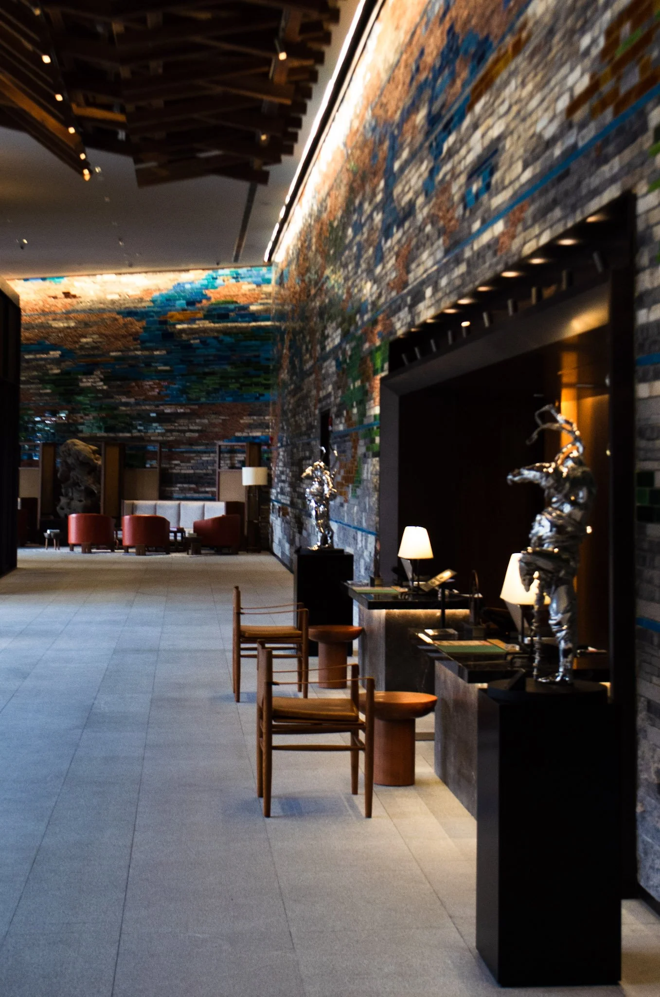 Walking through the property feels like exploring an open-air gallery. Every corner reveals curated pieces: translucent sculptures that echo misty mountain scenes, oversized paperweights shaped like ancient scrolls, and mosaic walls in vivid greens and blues reminiscent of Wang Ximeng’s iconic A Thousand Miles of Rivers and Mountains. The interplay between light and shadow, texture and color, turns the act of moving through the hotel into a meditative experience.
